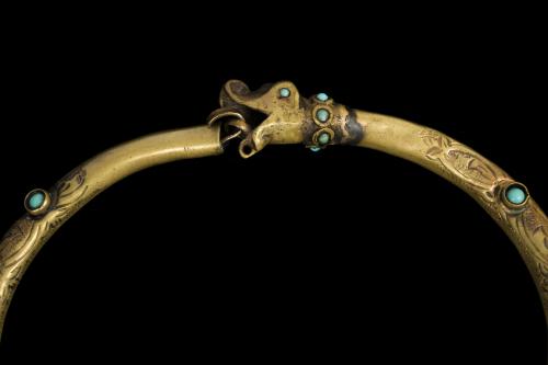 Cobre con baño dorado, turquesa, perlas de río y amatistas.