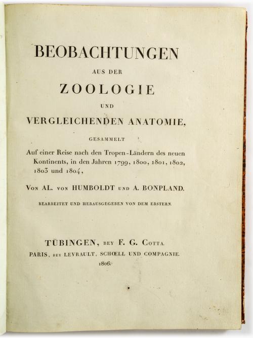 Importante obra de Humboldt titulada “Observaciones en zoología y anatomía comparada, recogidas en un viaje a los trópicos del Nuevo Continente, en los años 1799, 1800, 1801, 1802, 1803 y 1804, por Al. von Humboldt y A. Bonpland. Editado y corregido por A. von Humboldt. Tubinga: Cotta / París: Levrault, Schoell and Co. 1806. Con 14 grabados en cobre, 3 coloreados (Pl. V, VIII y X), y dos parcialmente coloreados (Pl. IV y VII). X, 212 pp., XIV. Esta edición parcial de la 2ª parte de la obra de los viajes americana se publicó en alemán y francés. Debido a las diferencias entre as editoriales francesa y alemana, la impresión de la edición alemana se suspendió después de este volumen. Contiene una descripción de Humboldt de los cóndores, monos, cocodrilos, etc. También propone un análisis histórico y comparativo de la anatomía de los reptiles y primates. El libro está completo de sus grabados, incluyendo los famosos cóndor y titi o mono ardilla (Vultur Gryphus Lin. y Simia Leonina), a color, ambos dibujados por el mismo Humboldt (“Humboldt del.”). Obra poco común.