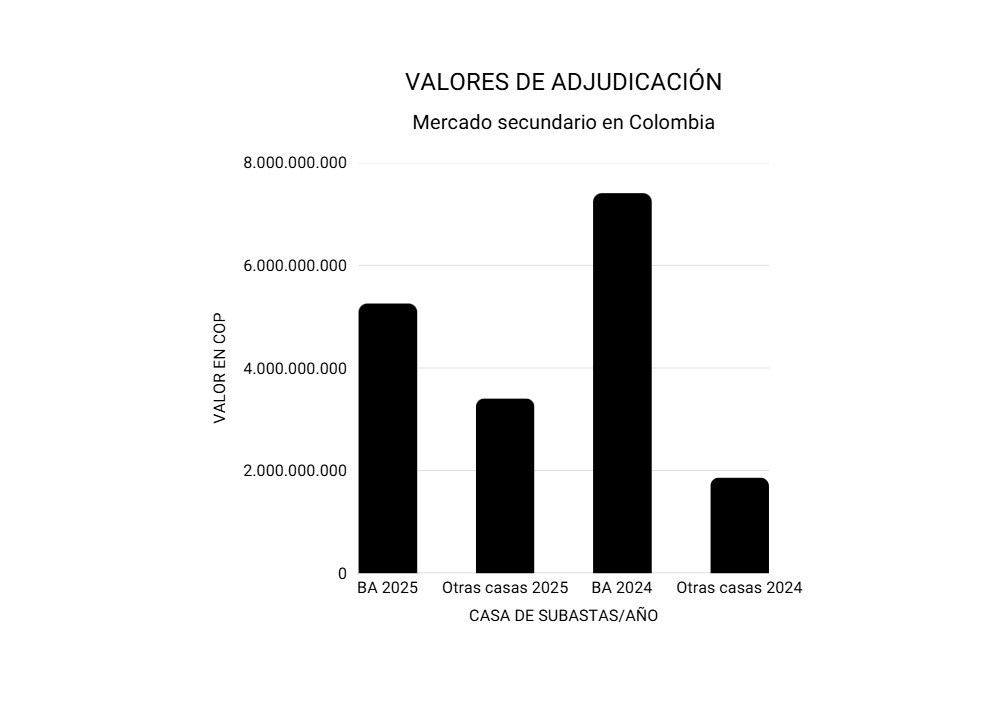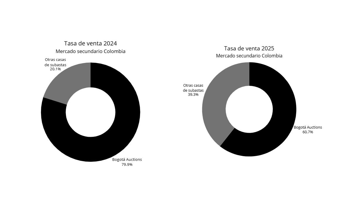 Al comparar este desempeño con el resto de los actores del mercado nacional ("Otras casas"), que alcanzan aproximadamente los $3.400.000.000 COP, queda en evidencia que Bogotá Auctions no solo vende más piezas, sino que gestiona activos de mayor valor y relevancia para el mercado del arte y objetos de colección.